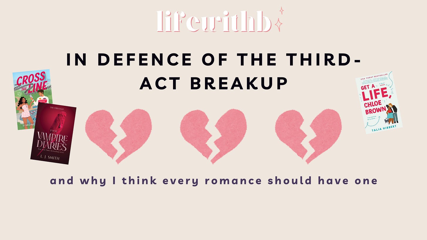 I used to hate it. My stomach would fill with dread at the thought of the oncoming heartbreak. I saw someone on Threads mention how they would stop reading romance books before the third act break-up to give the couple time to just be happy. I can emphasise with that feeling.